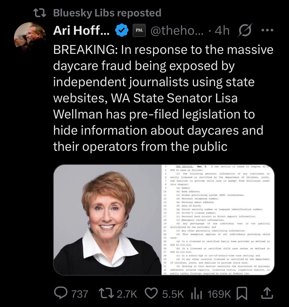 In response to the massive daycare fraud being exposed by independent journalists using state websites, WA State Senator Lisa Wellman has pre-filed legislation to hide information about daycares and their operators from the public.