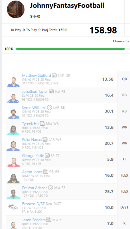 thought I was sunk after declining a Hurts+Henry for Herbert+JT trade before both got hurt (recognized it as a solid offer just didn't like Hurts 'cake' playoff schedule and assumed they would've clinched by then) but managed to survive and take down that team in the championship for a 4 figure payout