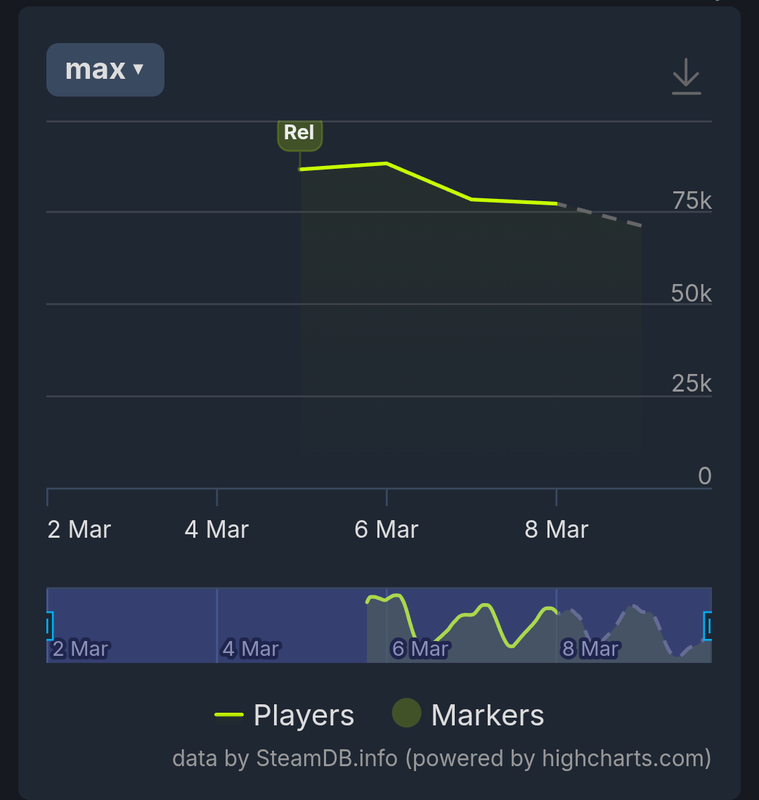 You own comparison shows its bearly scraping by and falling fast. Your comparing it to a 2 year old a 1+ year old game with actual sustained numbers now who had peaks of close to 500k and 750k players. This games peak of 88k, with already dropping weekly sustained counts, now in the 50ks with lows at 25k, isnt even comparable to those 2. Arc raiders is more comparable for recent games and it sustains 200k on average now during play times with a peak of almost 500k.