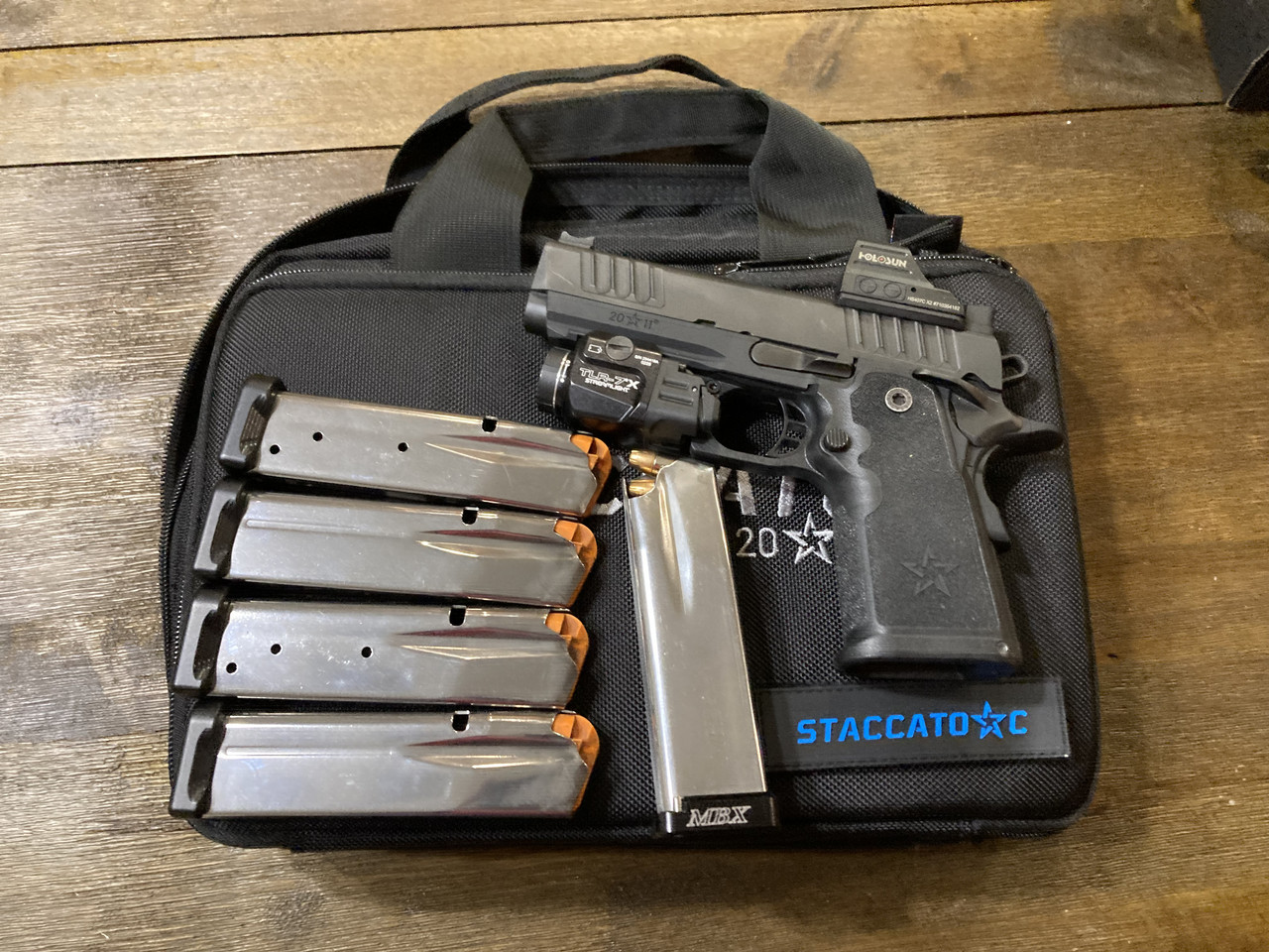 This model has the 15 round compact grip with stainless barrel and curved trigger. I am selling it with 4 Staccato 15 round magazines as well as an MBX 17 rounder. It comes with the original case and red dot cover plate.
