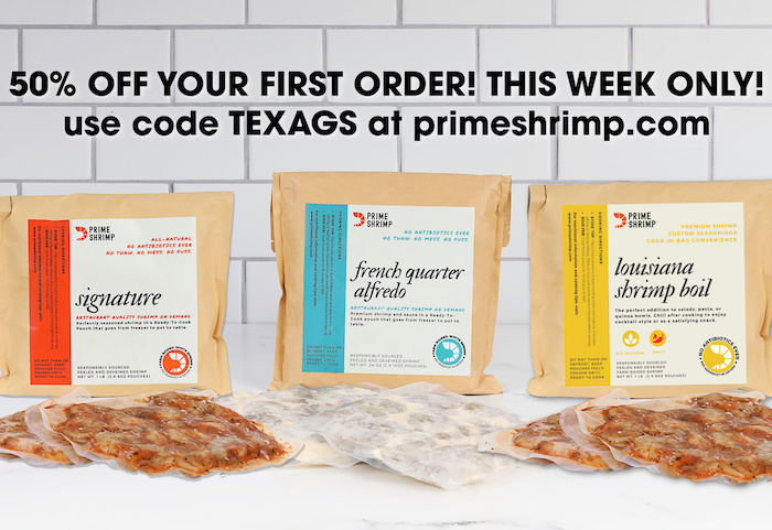Missed out on the half-priced offer? Not too late to take advantage of a great deal. Use code TexAgs when you check out for $20 off your first order at primeshrimp.com