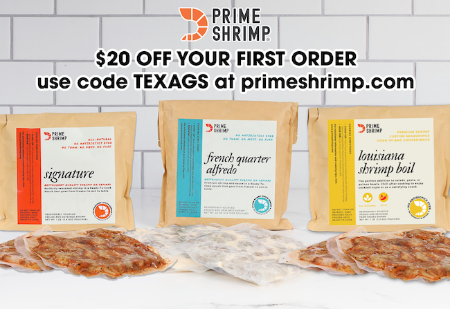 Our new sponsor Prime Shrimp is back to thank you for a big first month of orders out the door all over Texas and beyond to loyal Aggies! If you haven't yet, be sure to check out their offerings of delicious, easy-to-cook, ready in minutes shrimp in flavors such as Signature Seasoned, French Quarter Alfredo, Garlic Herb Buter, and Louisiana Shrimp Boil at primeshrimp.com. Remember, new customers get $20 off their first order with code TEXAGS at checkout.