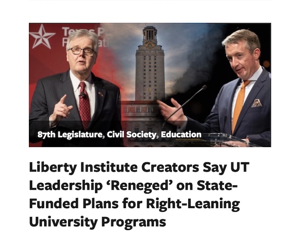 I hope you enjoy this article by Isaiah Mitchell, who checked in on the Liberty Institute, which was sold as "a world class enterprise dedicated to the study of individual liberty, free markets, political systems and associated institutions." However, the University of Texas professor who led the effort to create this institute claims university leadership is sabotaging the state-funded project - funded to the tune of six million dollars, by the way - and that a critical theorist is at the helm of the project. Read the article here.