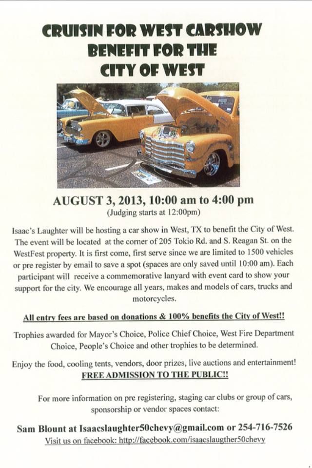 Isaac's Laughter is hosting a carshow in West to benefit the City this Saturday, August 3rd from 10-4. As the picture shows, admission is abosutely free. Slovaceks has donated all of the food (also free - donatations appreciated), and there will be 4 live bands. All entries and donations go to directly to the City of West. Please come out and support a great cause and see some awesome cars.