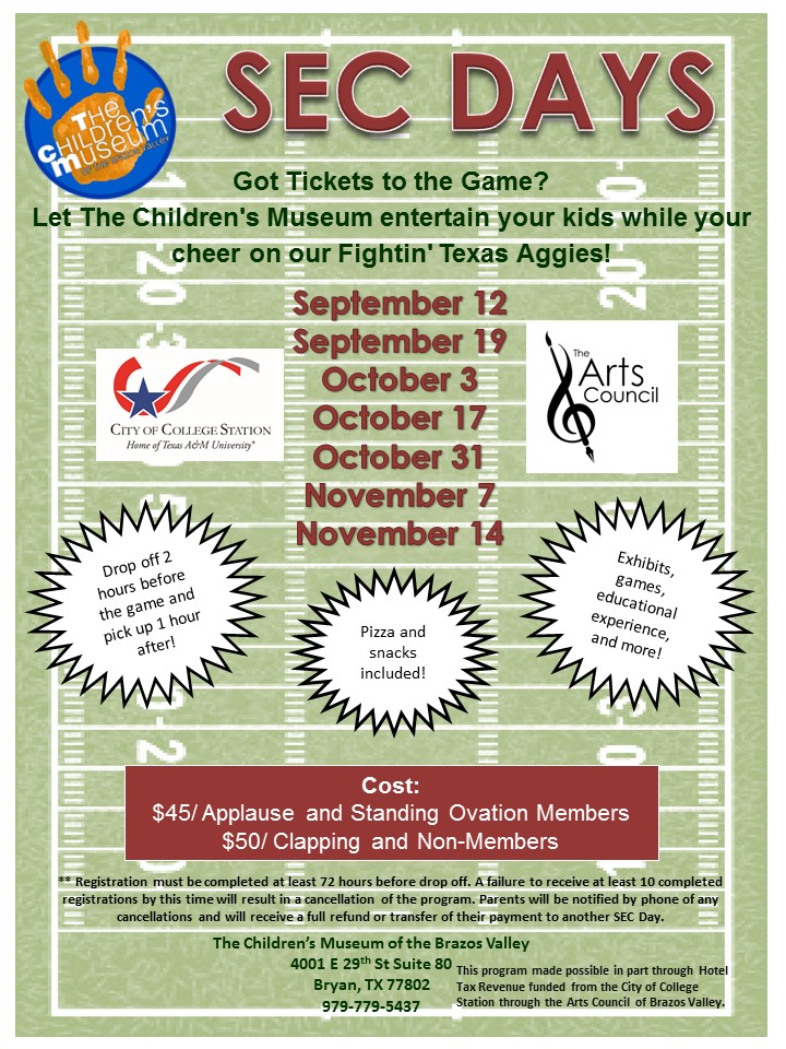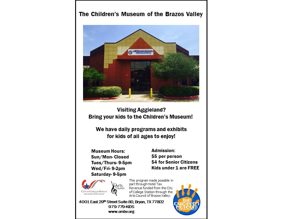 The Children's Museum of Brazos Valley would like to extend an invitation to those parents who may be looking for a safe environment, where their kids can learn and have fun during Texas A&M football games.