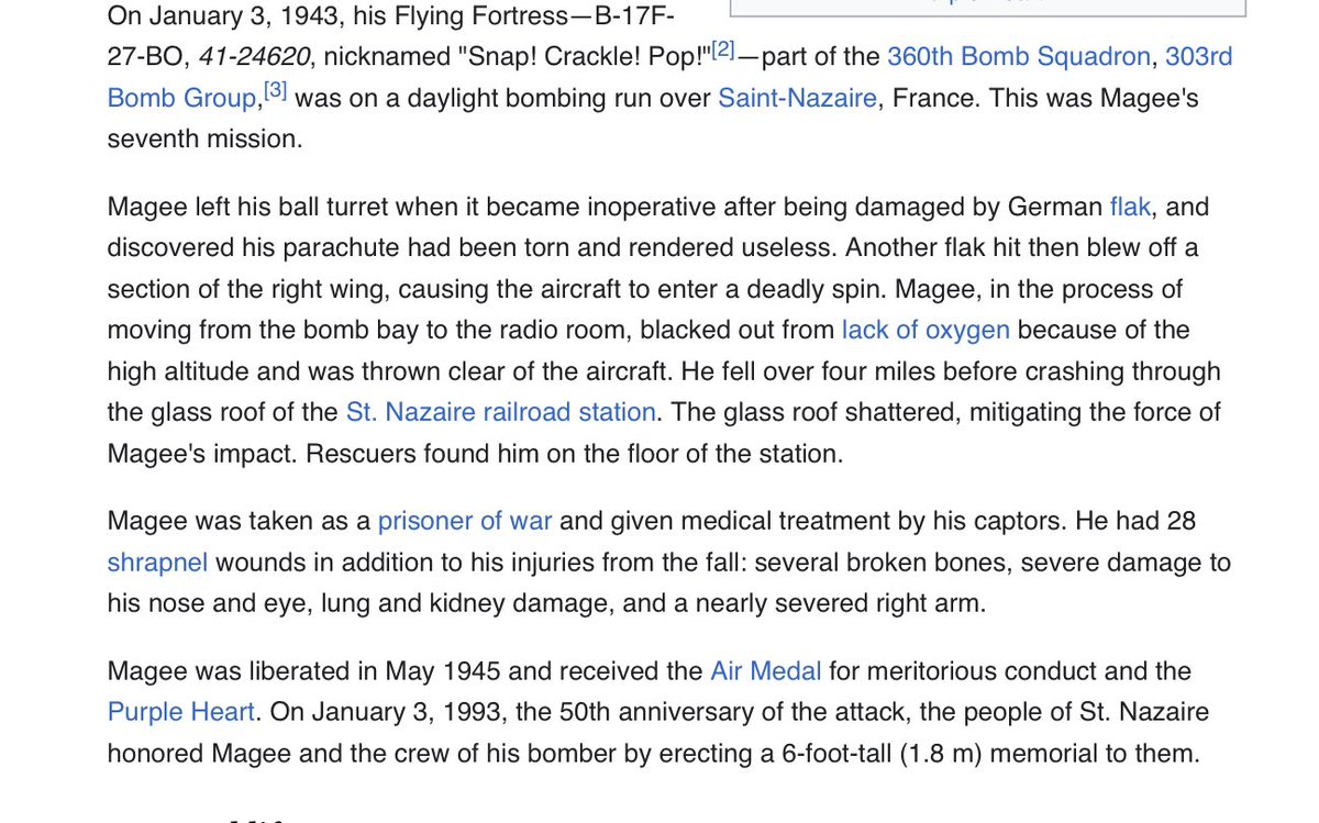 B-17 ball turret gunner Alan Magee, who fell 22,000 feet without a parachute, falling through the glass roof of St. Nazaire train station. In January of 1943. ✈️