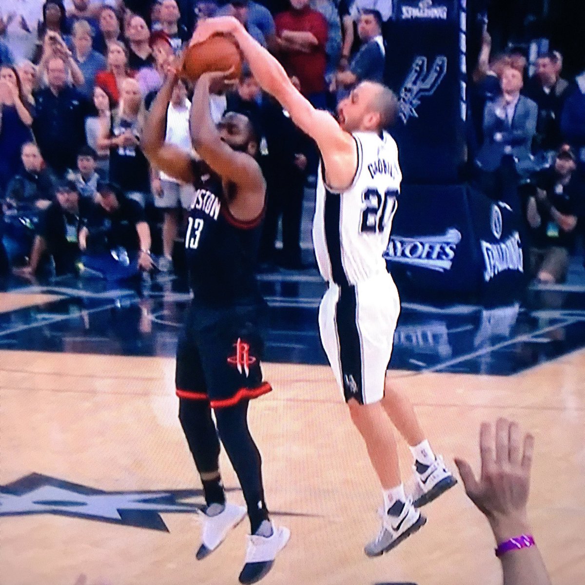 Ballsy by Manu to go for the block there. Got it clean. He knew James had to put it up or would've ended up like Mills in regulation. Great awareness there on his part.