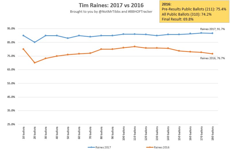Raines overtakes Bagwell for highest vote getter. B**** has been taking a hit, but Pudge has been left off even more lately.