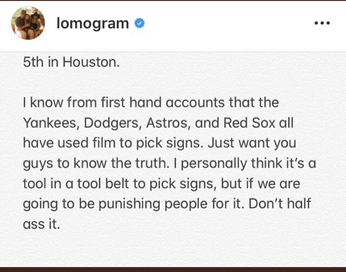 Username checks out. Every damned team has stolen signs since the beginning of baseball. Anyone that act like they are innocent is full of ***** You still have to hit the ball to even benefit anyways.